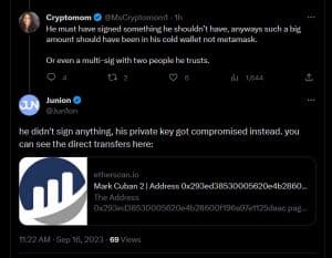Alguns sugeriram que Cuban pode ter assinado por engano uma transação maliciosa, enquanto outros afirmaram que a sua chave privada foi comprometida, visto que os fundos foram transferidos diretamente da carteira.