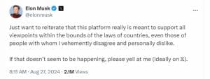 O colega bilionário da tecnologia, Elon Musk, reiterou que sua plataforma de mídia social, X, realmente foi criada para apoiar todos os pontos de vista dentro dos limites das leis dos países.