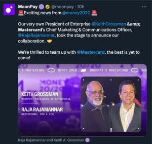 A empresa também recorreu ao X (antigo Twitter) para relatar que o presidente empresarial da MoonPay, Keith Grossman, e o diretor de marketing e comunicações da Mastercard, Raja Rajamannar, anunciaram a colaboração no Money20/20 em Las Vegas. Um representante da Mastercard confirmou a parceria.