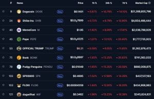 Novos favoritos como PEPE, BONK e FLOKI sofreram quedas ainda mais acentuadas, com perdas em sete dias variando de 11% a mais de 20% para os tokens mais afetados. Até mesmo o setor de finanças políticas sentiu o impacto, embora em menor grau. O token oficial de TRUMP, frequentemente usado como um indicador do sentimento político em torno do presidente dos Estados Unidos, caiu 11,65%. De forma semelhante, o SPX6900, um token criado como uma sátira ao índice de ações S&P 500 com o objetivo de inverter o mercado tradicional, perdeu 14,26% do seu valor. Embora essas perdas tenham sido substanciais, foram possivelmente menos severas do que as quedas de 20% observadas em grandes nomes baseados em SOLANA, como DOGWIFHAT e BONK, ou no token PUDGY PENGUINS.