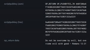 A mensagem é uma citação do sexto livro do Novo Testamento, a Epístola aos Romanos. Visto pela primeira vez por @emzy @bitcoinhackers.org, lê-se: