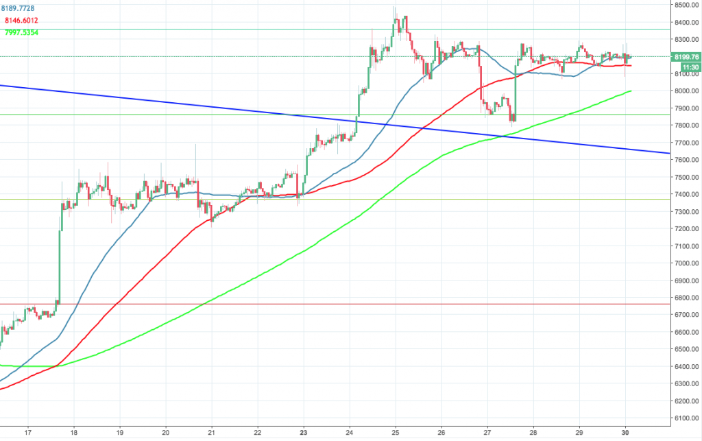 No nível intradiário, BTC/USD está suportado por as Médias Móveis de 50 e 100 (gráfico de 1 hora) atualmente em US$ 8.190 e US$ 8.146 respectivamente. Uma vez que esta área esteja desmarcada, a desvantagem pode ser estendida para US$ 8.000, que é reforçado pela Média Móvel de 200 períodos e pelos 50.0% de Fibo, em US$ 7.862. No lado positivo, a resistência local é criada por US $ 8.274 (alta asiática), seguida por US$ 8.300.