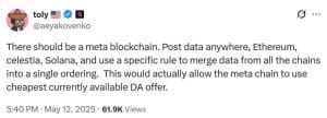 Em uma publicação, Yakovenko apresentou o conceito de “meta blockchain” — uma camada unificada projetada para agregar e sequenciar dados provenientes de múltiplas blockchains de camada 1, incluindo Ethereum, Celestia e a própria Solana.