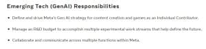 De acordo com uma lista de empregos recente, a Meta deseja pesquisar e criar protótipos de novas experiências de consumo usando IA generativa, como jogos que sejam não determinísticos, personalizados e que mudem toda vez que você os jogar.