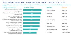 A empresa de pesquisa de mercado, Ipsos, divulgou os resultados da pesquisa mostrando que o conceito agora é amplamente reconhecido: 52% dos mais de 21.000 adultos pesquisados em 29 países estão familiarizados com o Metaverso e 50% têm sentimentos positivos sobre se envolver com ele no dia a dia.