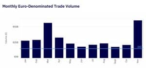 O artigo relata que os volumes de negociação denominados em euros excederam continuamente a média de 2023 em 2024, com picos notáveis em março e novembro, cada um acima de US$42 bilhões em volume de negociação mensal. Essa tendência ascendente é indicativa da crescente importância do euro nos mercados de criptomoedas.
