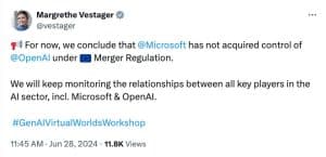 A chefe de concorrência da UE, Margrethe Vestager, também disse que os reguladores locais buscarão opiniões adicionais de terceiros e pesquisarão empresas como Microsoft, Google, Meta e TikTok da ByteDance em relação às suas parcerias de IA.