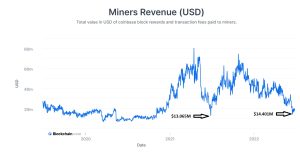 As mudanças nos preços do Bitcoin afetam diretamente a renda dos mineradores, que ganham recompensas fixas em blocos e taxas de transação em BTC para executar suas operações de mineração. Em junho de 2022, a receita total de mineração caiu abaixo da faixa de US$20 milhões, com os dados do Blockchain.com registrando a menor queda de US$14,401 milhões em 17 de junho.