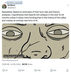 Ele segue relatórios recentes de que a OpenAI pode perder até US$5 bilhões em 2024, colocando a empresa em risco de ficar sem dinheiro em 12 meses.
