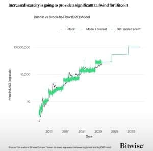 O modelo Stock-to-Flow, ou S2F, é elegante em sua simplicidade. Ele trata o Bitcoin como uma commodity escassa, como ouro ou prata. Ele mede a escassez dividindo a oferta total em circulação (o “estoque”) pela quantidade de nova oferta criada a cada ano (o “fluxo”). A programação central do BITCOIN torna essa equação previsível. A cada quatro anos, um evento de “halving” reduz a nova oferta pela metade, tornando automaticamente o ativo duas vezes mais escasso. O modelo S2F compara essa escassez crescente com o preço do Bitcoin e, em ciclos anteriores, o preço seguiu sua trajetória com notável precisão.