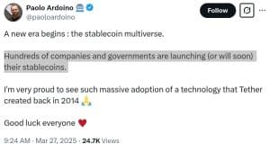 Em uma publicação no X (antigo Twitter), Ardoino sugeriu que a adoção de stablecoins está crescendo a uma taxa sem precedentes, com mais stablecoins sendo lançadas para atender a diferentes casos de uso e ecossistemas financeiros em todo o mundo. No entanto, especialistas do setor permanecem céticos, questionando se essa expansão é realmente sustentável diante de regulamentações rígidas e concorrência crescente.