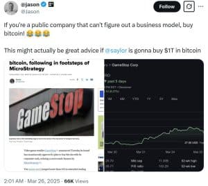 O investidor Jason Calacanis, estava entre os críticos da decisão da GameStop. Em uma postagem nas redes sociais, ele sugeriu sarcasticamente que comprar Bitcoin pode ser uma estratégia para empresas de capital aberto que lutam para estabelecer um modelo de negócios sustentável. Ele fez referência a Michael Saylor, o cofundador da MicroStrategy, uma empresa conhecida por suas aquisições agressivas de Bitcoin, sugerindo que a GameStop pode estar seguindo um manual semelhante sem um plano claro de longo prazo.