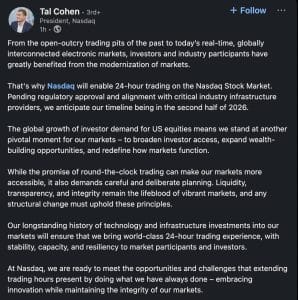A mudança da Nasdaq não está ocorrendo isoladamente. Outras grandes bolsas, como a Bolsa de Valores de Nova York (NYSE) e a Cboe Global Markets (CBOE), também exploraram a expansão do horário de negociação para acomodar investidores globais. Em outubro de 2024, a NYSE propôs um modelo para negociação quase 24 horas por dia, e a CBOE sugeriu ambições semelhantes.