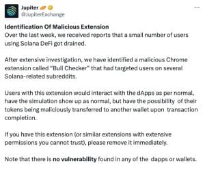 Em uma publicação, o fundador do Jupiter, Meow, disse que o “Bull Checker” — uma extensão maliciosa do navegador Google Chrome — estava mirando usuários do Solana no Reddit, anunciando-se como uma extensão para visualizar todos os detentores de memecoins específicos.