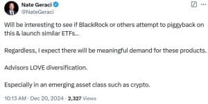 Nate Geraci, presidente da The ETF Store, uma empresa de consultoria focada em ETFs, levanta a hipótese no Twitter (X) de que outros grandes gestores de ativos (por exemplo, BlackRock) podem fazer o mesmo e lançar seus próprios ETFs de criptomoedas. Ele destacou que a demanda de investimento por produtos diversificados em novas classes de ativos, como criptomoedas, provavelmente aumentará, especialmente com os investidores institucionais ainda buscando mais maneiras de ganhar exposição no mercado crescente de novas classes de ativos. Geraci observou: