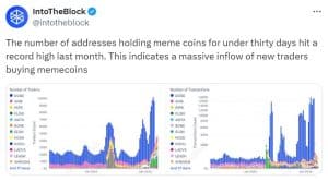 A plataforma de inteligência de mercado, IntoTheBlock, mostra que o número de endereços de carteira contendo tokens relacionados a memes por menos de 30 dias atingiu um recorde.