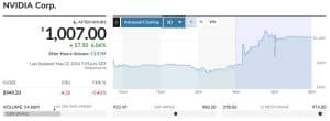 Os lucros fizeram com que os preços das ações do NVDA subissem para um máximo histórico nas negociações após o expediente, de pouco mais de US$1.000, elevando sua capitalização de mercado para mais de US$2,5 trilhões.