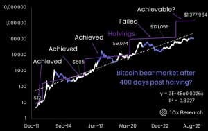 Isso levou a 10X RESEARCH a uma previsão de preço muito mais modesta do que muitas outras no setor. Enquanto outros modelos baseados em ciclos passados prevêem metas extremamente otimistas, a 10X projetou um pico de ciclo de 125.000 dólares para o final do ano. Embora isso possa parecer pessimista para alguns, essa projeção vem da mesma metodologia que a empresa usou para identificar corretamente o fundo do mercado de baixa em outubro de 2022, o que lhe confere um grau significativo de credibilidade.