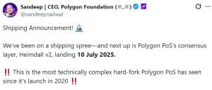 A atualização para o Heimdall 2.0 também ocorre na esteira de uma mudança mais ampla na liderança da Polygon. Em junho de 2025, Sandeep Nailwal assumiu o controle executivo total da Polygon como seu primeiro CEO. Essa mudança marcou uma mudança estratégica, de uma governança descentralizada para uma estrutura de liderança mais simplificada, com o objetivo de acelerar o roteiro e a tomada de decisões da empresa. Nailwal argumentou: