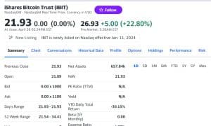O iShares Bitcoin Trust da BlackRock, com o símbolo IBIT, começou a ser negociado no pré-mercado e atualmente está em alta de 22,25%, sendo negociado a US$26,81. O fundo iShares está listado na bolsa Nasdaq.