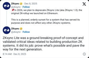 De acordo com a equipe, o ZKSYNC LITE — originalmente conhecido simplesmente como ZKSYNC 1.0 — nunca teve a intenção de ser o destino final. Em vez disso, serviu como uma “prova de conceito inovadora” projetada para validar que as provas de validade poderiam escalar o ETHEREUM com segurança, sem comprometer suas garantias de segurança subjacentes. Tendo pavimentado o caminho para a próxima geração de infraestrutura, a rede cumpriu sua missão com sucesso.