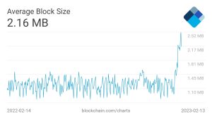 O tamanho médio do bloco do Bitcoin atingiu máximos históricos acima de 2,5 megabytes (MB) pela primeira vez desde a sua criação em 2009, impulsionado pelo lançamento do protocolo Ordinals de NFTs em janeiro de 2023.