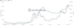 De acordo com uma publicação da plataforma de inteligência de criptomoedas IntoTheBlock, a oferta de stablecoins atingiu uma nova alta de US$219 bilhões. Isso marca um aumento significativo em relação ao pico anterior de US$187 bilhões, que ocorreu em abril de 2022, logo antes do início do mercado em baixa. O aumento contínuo na oferta de stablecoins, apesar da recente queda nos preços das criptomoedas, sugere que provavelmente estamos no meio de um ciclo de alta, em vez de nos aproximarmos do fim.