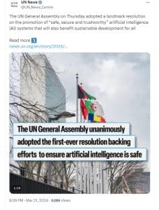 A Assembleia Geral das Nações Unidas (ONU) aprovou uma resolução relativa à inteligência artificial (IA). A resolução representa o esforço mais recente entre várias iniciativas governamentais em todo o mundo destinadas a influenciar o desenvolvimento da IA.