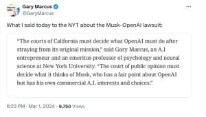 Musk entrou com uma ação judicial contra a OpenAI em fevereiro, alegando que a empresa havia se desviado de suas raízes “sem fins lucrativos”. Então, questões em torno da possível mudança da OpenAI para um modelo “com fins lucrativos”, conforme descrito na ação judicial, estimularam conversas em toda a comunidade de IA sobre a legalidade do modelo de negócios da OpenAI.
