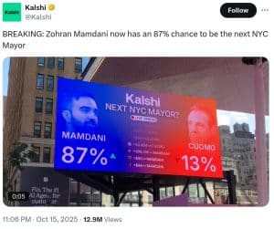 Esse esforço resultou em níveis sem precedentes de visibilidade pública. Um vídeo recente de um telão gigante na cidade de Nova York, exibindo a transmissão ao vivo do mercado da Kalshi para a eleição para prefeito da cidade, atraiu quase treze milhões de visualizações somente na plataforma X.