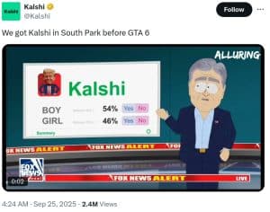 Essa penetração cultural foi solidificada quando a Kalshi foi recentemente apresentada e satirizada em um episódio de South Park, um pilar da cultura pop que consolidou a chegada da plataforma ao zeitgeist.