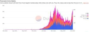 Os dados que sustentam essa tendência mostram tanto um pico espetacular quanto um crescimento notável e sustentado. A popularidade do Polymarket explodiu durante o ciclo eleitoral de 2024, com suas carteiras ativas diárias atingindo um recorde de mais de 72.600 em janeiro de 2025 e suas transações diárias chegando a quase 590.000. Embora a plataforma não tenha retornado a esses picos frenéticos, seu uso atual permanece extremamente alto. Só neste mês, processou mais de um bilhão de dólares em volume de negociações, elevando seu total acumulado para mais de 15,7 bilhões de dólares.