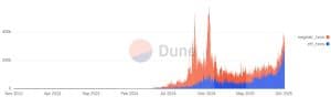 O valor total bloqueado no protocolo conta uma história semelhante. Depois de atingir o pico de quase 512 milhões de dólares durante as eleições, estabilizou-se em mais de 194 milhões. Embora isso represente uma queda de 62% em relação ao pico histórico, constitui um aumento impressionante de 2.325% em relação aos oito milhões registrados um ano antes. Esses dados não representam uma moda passageira, mas sim um mercado que sobreviveu à especulação e manteve uma base sólida de usuários.