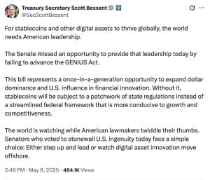 No entanto, o cenário regulatório para stablecoins permanece complexo. Em maio de 2025, senadores democratas bloquearam o projeto de lei ‘GENIUS Stablecoin’, que visava estabelecer regulamentações abrangentes para stablecoins. O fracasso em avançar com esse projeto representa um retrocesso para o governo Trump, que havia defendido fortemente a regulamentação das stablecoins como forma de aumentar o domínio do dólar. O Secretário do Tesouro, Scott Bessent, criticou a decisão do Senado, chamando-a de uma oportunidade perdida de expandir o poder financeiro dos EUA.