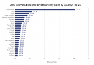 Uma análise geográfica dos ganhos realizados com Bitcoin revelou que os investidores nos Estados Unidos geraram US$4,1 bilhões em retornos no ano passado, o que é mais de três vezes maior do que o segundo colocado na China. Embora empresas de peso econômico como Japão, Reino Unido e Alemanha estivessem perto do topo da lista, vários países estão investindo muito mais em Bitcoin em relação às métricas econômicas tradicionais, como o produto interno bruto.