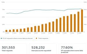 Desde julho de 2013, o Meta atendeu a mais de 301.000 solicitações de autoridades, fornecendo dados de usuários para mais de 77% do total de 528.000 solicitações legais recebidas, de acordo com a página de política do Meta.