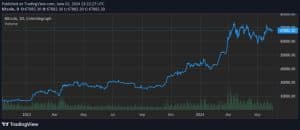 (Dados do TradingView mostrando o crescimento do preço do Bitcoin desde o final de 2022.)