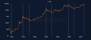 O Bitcoin caiu abaixo de uma trajetória de crescimento pós-halving importante quando caiu abaixo de US$63.000, mas recuperar a linha de tendência antes do corte do final de 2024 colocou o Bitcoin de volta no caminho para a marca de US$100.000, com base em ciclos anteriores de halving do Bitcoin.