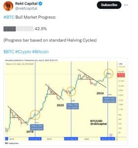 A análise de Thompson se alinha com as de outros analistas de criptomoedas notáveis, incluindo a Rekt Capital. O analista popular acredita que estamos 42,5% no atual ciclo de alta, com base nos ciclos anteriores de redução pela metade do Bitcoin.