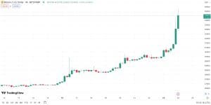 O preço do Bitcoin disparou repentinamente, com o BTC ganhando mais de 10%, de US$31.000 para mais de US$34.000.
