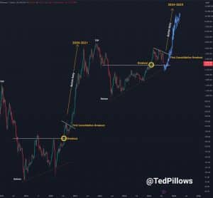 No entanto, o preço do Ether pode ser definido para um rompimento no primeiro trimestre de 2025, com base em padrões históricos de gráficos, de acordo com o popular trader de criptomoedas Ted, que escreveu: