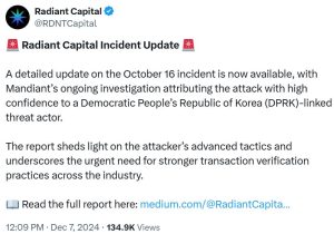 Em outubro de 2024, a plataforma de finanças descentralizadas (DeFi) Radiant Capital sofreu uma violação de segurança substancial, resultando em uma perda de US$50 milhões. As investigações atribuíram esses ataques a um adversário apoiado pela Coreia do Norte. A violação foi executada por meio de táticas sofisticadas de engenharia social, onde o invasor se fez passar por um ex-contratado e disseminou malware por meio de uma mensagem do Telegram. Um desenvolvedor da Radiant recebeu um arquivo zip dessa fonte confiável, que, ao ser compartilhado entre outros desenvolvedores, implantou malware facilitando o acesso não autorizado aos sistemas da plataforma.