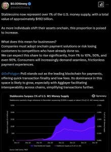 Marc Boiron, CEO do Polygon Labs, atribui grande parte desse aumento à integração de stablecoins por empresas como Stripe e PayPal, que tornaram cada vez mais conveniente para as empresas aceitar pagamentos em tokens equivalentes a fiduciários.