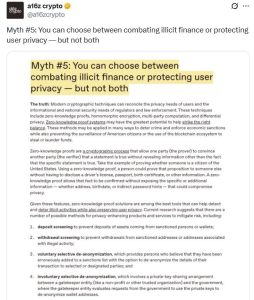 A Andreessen Horowitz (A16z), empresa de capital de risco focada em criptomoedas, argumenta que as tecnologias criptográficas que aumentam a privacidade, particularmente as provas de conhecimento zero (provas ZK), oferecem um caminho para conciliar a privacidade do usuário com as exigências das autoridades policiais.