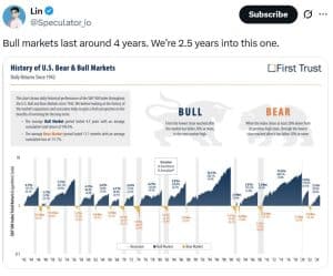 Ryan McMillin, cofundador e diretor de investimentos da gestora australiana de investimentos em criptomoedas Merkle Tree Capital, sugeriu que o ciclo atual pode seguir um padrão diferente. Ele projeta um topo potencial por volta do segundo trimestre de 2026, seguido por uma leve baixa do mercado caso as condições globais de liquidez se invertam. Fatores como a perda de alavancagem decorrente de compras de Bitcoin alimentadas por dívidas ou choques regulatórios podem servir como catalisadores para tal retração.
