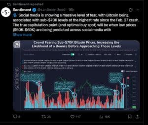 A Santiment, uma plataforma de análise on-chain, relatou que o sentimento da mídia social em torno do Bitcoin atingiu níveis extremamente baixos. Em particular, o Bitcoin tem sido frequentemente associado a preços abaixo de US$70.000, um nível não visto desde a queda dramática em fevereiro. Esse tipo de medo, frequentemente acompanhado de menções de preços mais baixos, é conhecido como capitulação — um evento em que os investidores vendem seus ativos com prejuízo devido ao pânico ou medo de novas quedas.