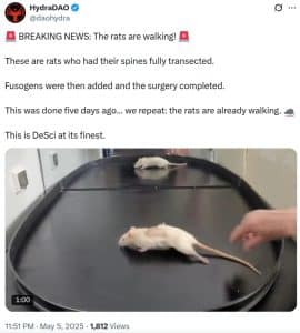 Uma iniciativa científica descentralizada, a HydraDAO, relatou recentemente um avanço significativo na pesquisa sobre lesões na medula espinhal. De acordo com o anúncio, pesquisadores desenvolveram uma nova técnica que permitiu que ratos com medula espinhal completamente rompida recuperassem a mobilidade em apenas cinco dias. Essa rápida recuperação foi alcançada por meio da aplicação de um composto especializado conhecido como Neuro-PEG, uma combinação de polietilenoglicol (PEG) e quitosana, substâncias conhecidas por sua capacidade de fundir membranas celulares.