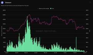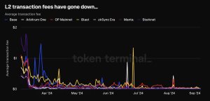 De acordo com dados do Token Terminal, as taxas de rede atingiram seus níveis mais altos do ano em março de 2024, em US$35,5 milhões. A atualização do Dencun — que reduziu significativamente as taxas para transações Ethereum layer-2 — entrou em operação em março de 2024.