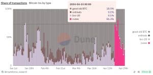 No entanto, o BTC acabou recuperando a maior parte das transações na rede. O BTC representava 77,8% de todas as transações de Bitcoin, enquanto os Runes contribuíam com 18,8%. Outras transações na rede Bitcoin compreendem transações Ordinals (1,2%) e BRC-20 (2,3%).