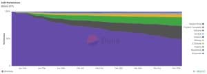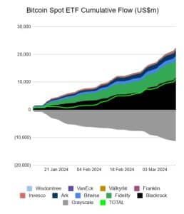 No primeiro dia de negociação dos 10 ETFs Bitcoin à vista dos EUA, o fundo da Grayscale representava cerca de 99,5% do total de seus ativos sob gestão. No entanto, as saídas diárias consistentes do GBTC – que atingiram uma média de 329 milhões de dólares por dia na semana passada – corroeram a quota de mercado do ETF ao longo do tempo.